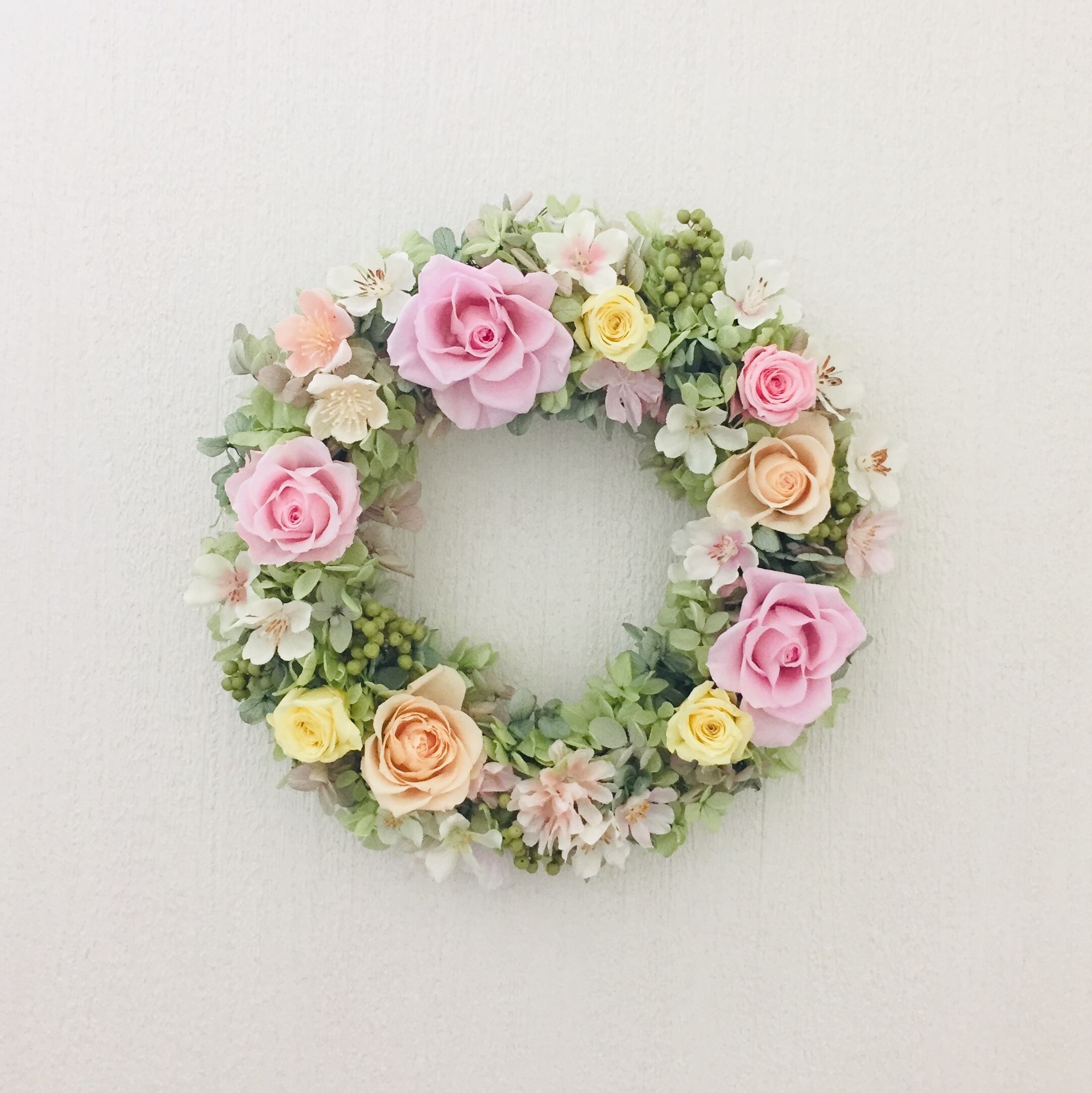 春先の淡い色合いでまとめたリースです。 ボリュームがあり、存在感のあるリースです。 (クリアケース付き) <本体サイズ> サイズ本体 横約25㎝ 縦約25㎝ 高さ約7㎝ 重さ 100g ◆クリアケースサイズ 横30㎝ × 縦30㎝ × 高さ8㎝