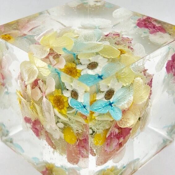 まるでクリスタルの中に花が浮いているように見え、光にあたり反射して何重にも花が見える不思議なインテリア雑貨。ギリシャのエーゲ海をイメージしました。深いブルーから淡いブルーを1つのボールに合わせてどこから見てもブルーフラワーが楽しめます。